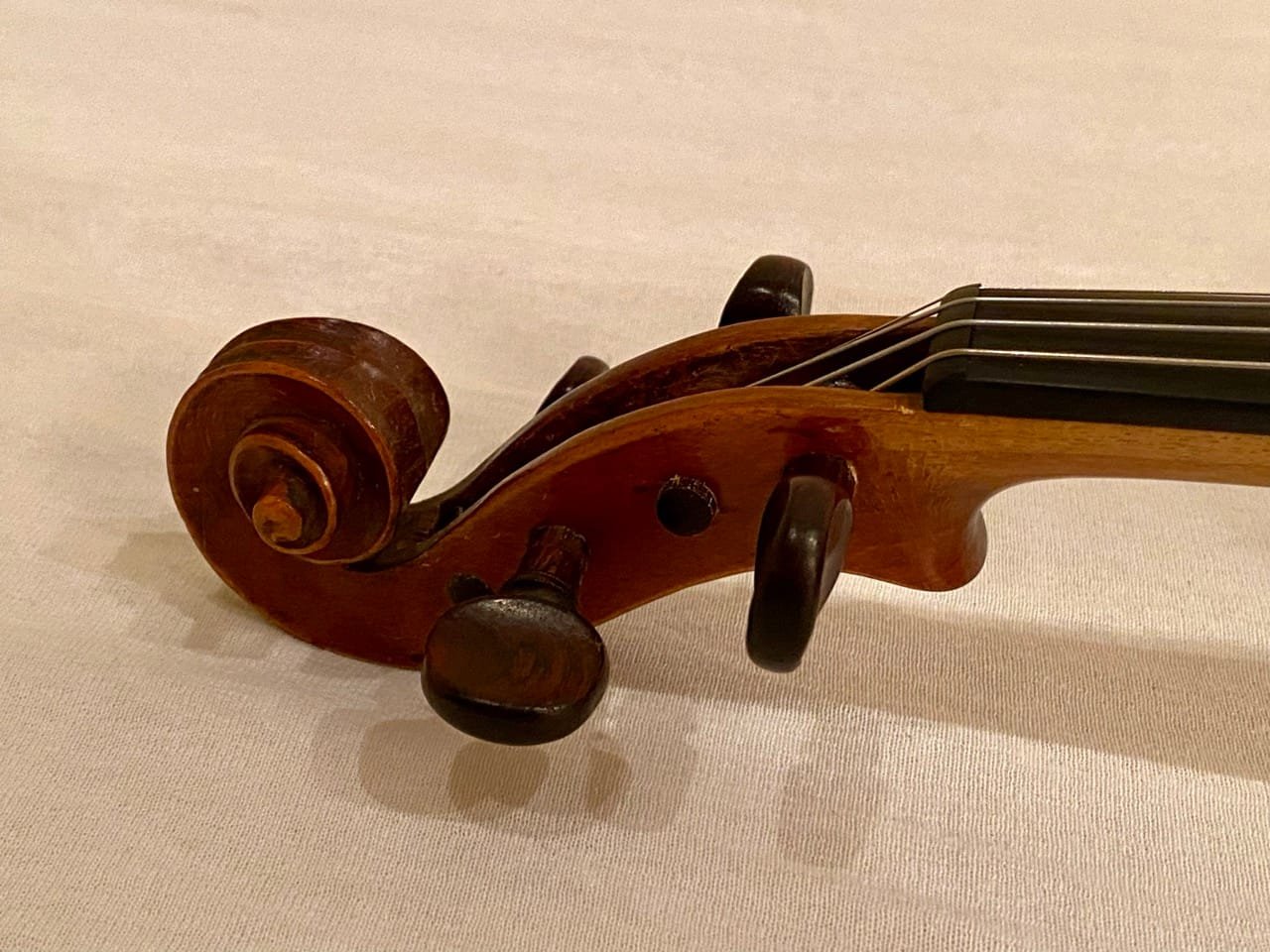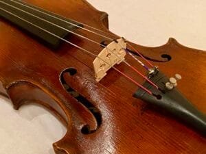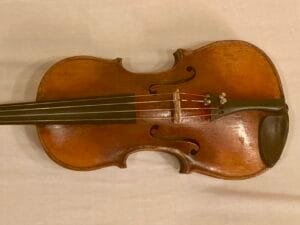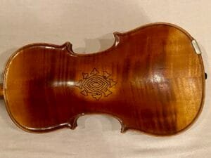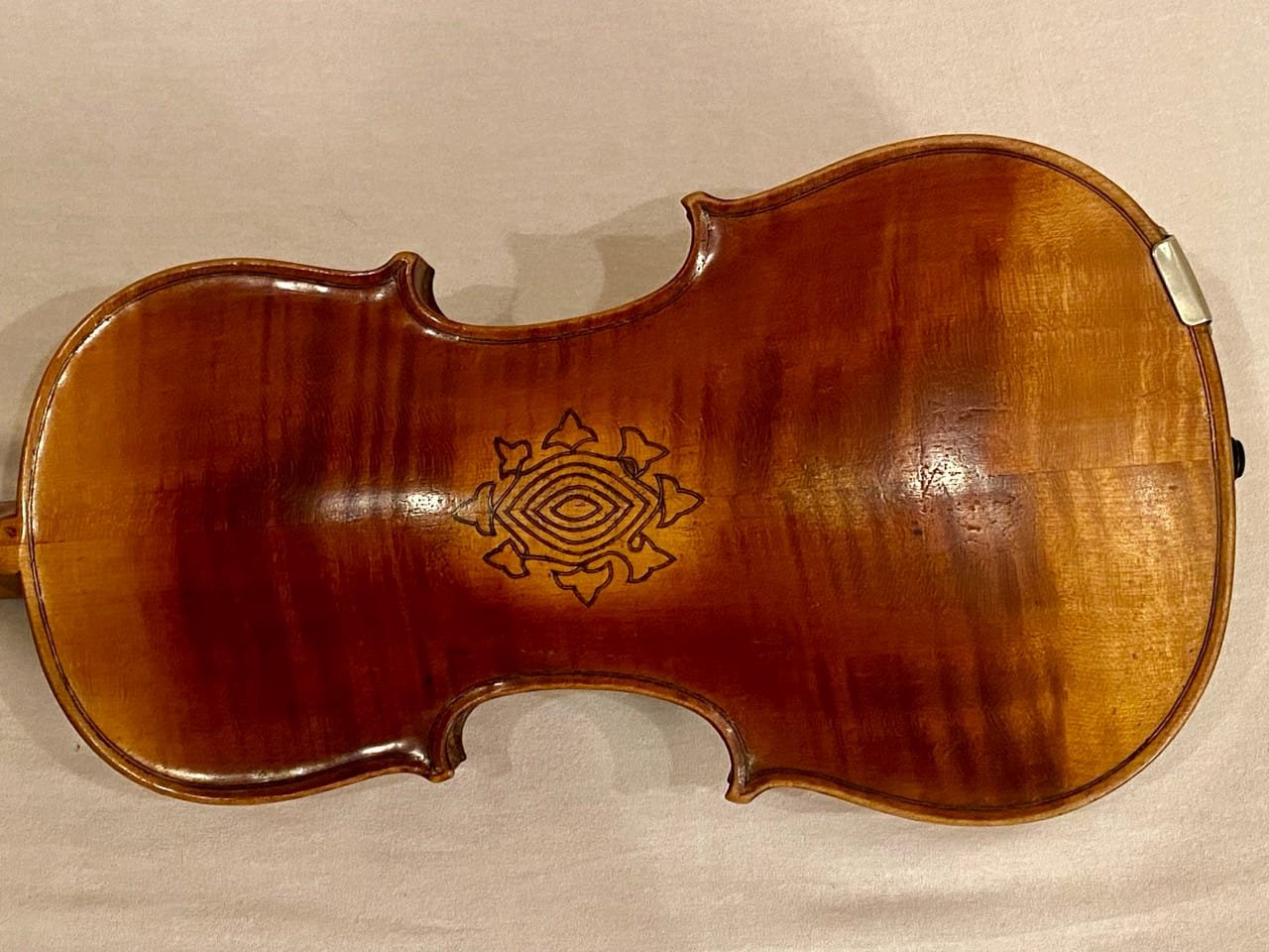 Fiolin med flott mønster/dekorasjon på bunn. Justert og nyrigget av fiolinmaker i 2025.